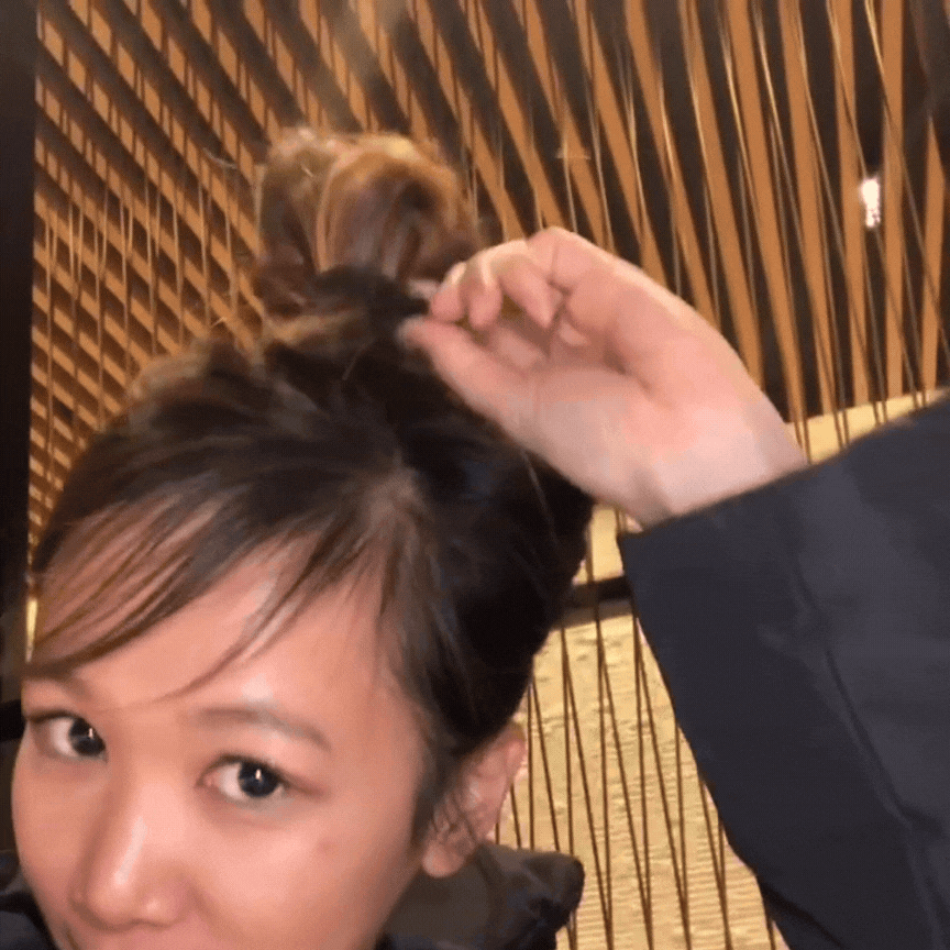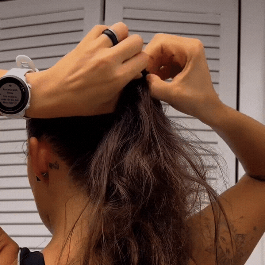 - Optional: Unbuckle to adjust and tighten the Buckle Hair Tie if you need one more loop around